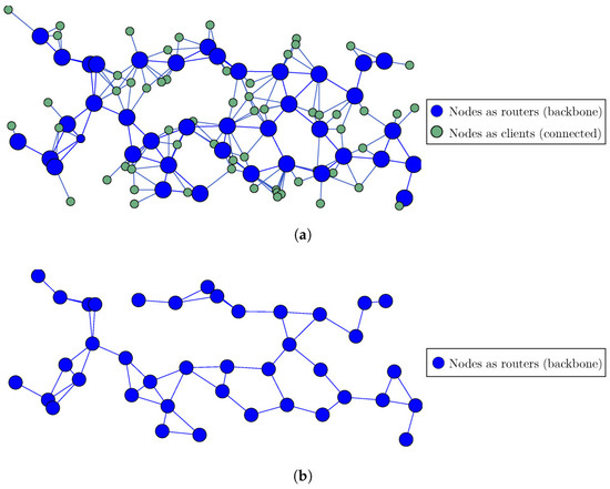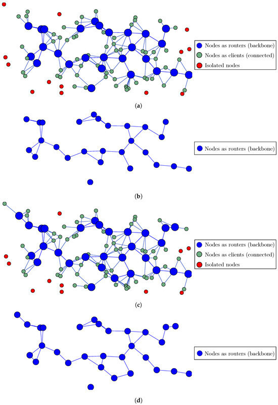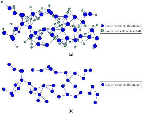 The challenge inherent in finding a Dominant Set (DS) hinges on identifying a subset D of nodes in the network graph, such that each node belongs to D or is adjacent to it [30]. The formation of a connected graph by the nodes within this DS results in the transition of the DS to the form of a CDS. The nodes that comprise the CDS constitute the network’s backbone. The quality of the resultant reduced topology can be assessed on various criteria, including connectivity, energy efficiency, throughput, and resilience to mobility dynamics [31].