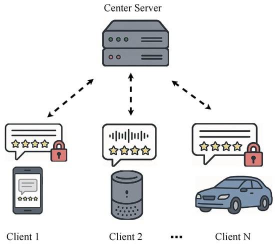 Detecting fake reviews in the IoT ecosystem presents a unique and formidable set of challenges that transcend those of traditional web platforms [6,7]. As depicted in Figure 1, review data is not centralized but is naturally siloed across a multitude of heterogeneous IoT platforms. A user might review a service via a voice command on a smart speaker, a text entry on a smart TV, or a rating on a companion mobile app. This leads to three primary challenges. First, data silos and privacy: User data is distributed and often contains sensitive personal information. Centralizing this data for analysis is often infeasible due to privacy regulations like GDPR and CCPA, as well as prohibitive communication costs. Second, data heterogeneity: The data is Non-IID (Non-Independent and Identically Distributed). Different devices generate data with varying statistical properties, modalities (text, audio, ratings), and, critically, varying quality. Some clients may be sources of high-fidelity data, while others might unknowingly or maliciously contribute low-quality or poisoned data. Third, system heterogeneity: The IoT devices themselves possess disparate computational capabilities, network connectivity, and power constraints. A robust solution must be efficient and adaptable to this diverse hardware landscape.
