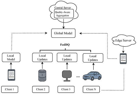 Second, edge servers act as intermediaries in large-scale IoT deployments, managing clusters of clients such as those within a smart home or vehicle. They can perform partial model aggregation to reduce the communication load on the central server. While our primary model focuses on a two-tier client–server architecture, the framework is extensible to a hierarchical structure.