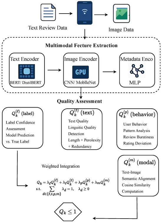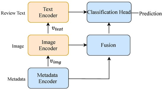 Multi-modal feature fusion architecture. Text, image, and metadata from a review are processed by specialized encoders. The resulting feature vectors are fused and passed to a classification head to generate a prediction.
