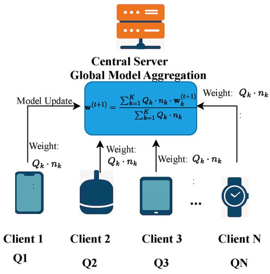 At the end of a communication round t, each client k sends its updated model parameters and its quality score to the server. The server then performs Quality-Aware Federated Averaging (Q-FedAvg). Instead of weighting by just the dataset size , we incorporate the quality score . To defend against malicious clients reporting a fraudulent high , the server performs a verification step. It maintains a small, clean validation dataset. Before the final aggregation, it can provisionally test each client’s update and penalize clients whose updates degrade performance on this set, overriding their self-reported score. The global model is updated as shown in Figure 5: