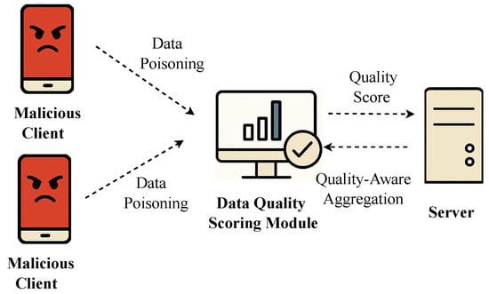 Threat model and defense strategy in FedDQ. Malicious clients attempting data poisoning attacks are detected by the local quality scoring module (). Their harmful updates are then mitigated by the quality-aware aggregation at the server.