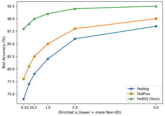 To simulate a heterogeneous IoT environment, we distributed the data among clients. We simulated Non-IID data distributions using a Dirichlet distribution () over the class labels. A low concentration parameter created a highly heterogeneous scenario where each client’s data distribution was skewed, while created a more homogeneous (near-IID) scenario for comparison.
