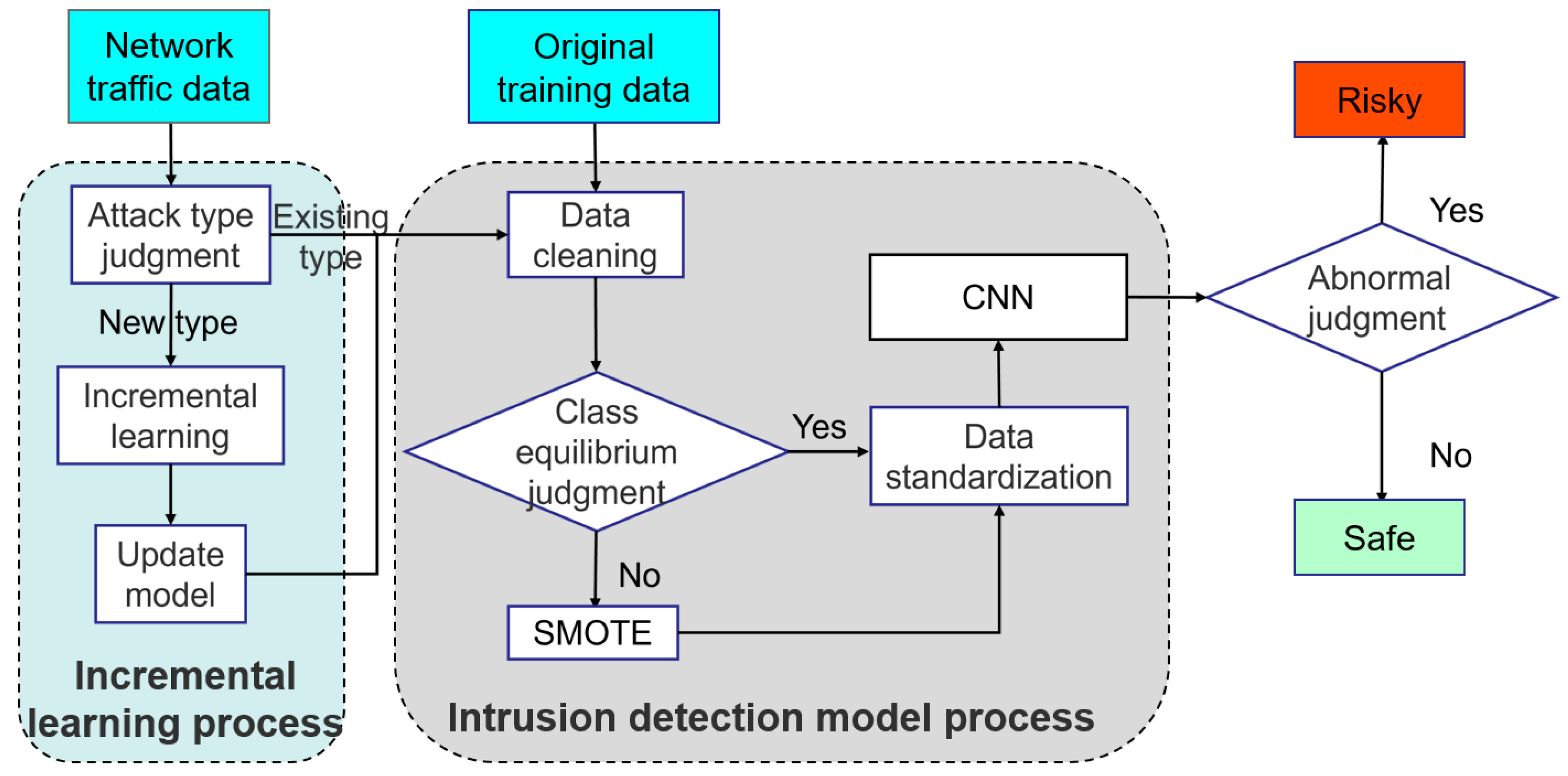 Figure 2, the overall architecture is mainly composed of two core components: an intrusion detection model and an incremental learning module, where the intrusion detection model is divided into two submodules: data preprocessing and model training. As shown in the intrusion detection model flow in
