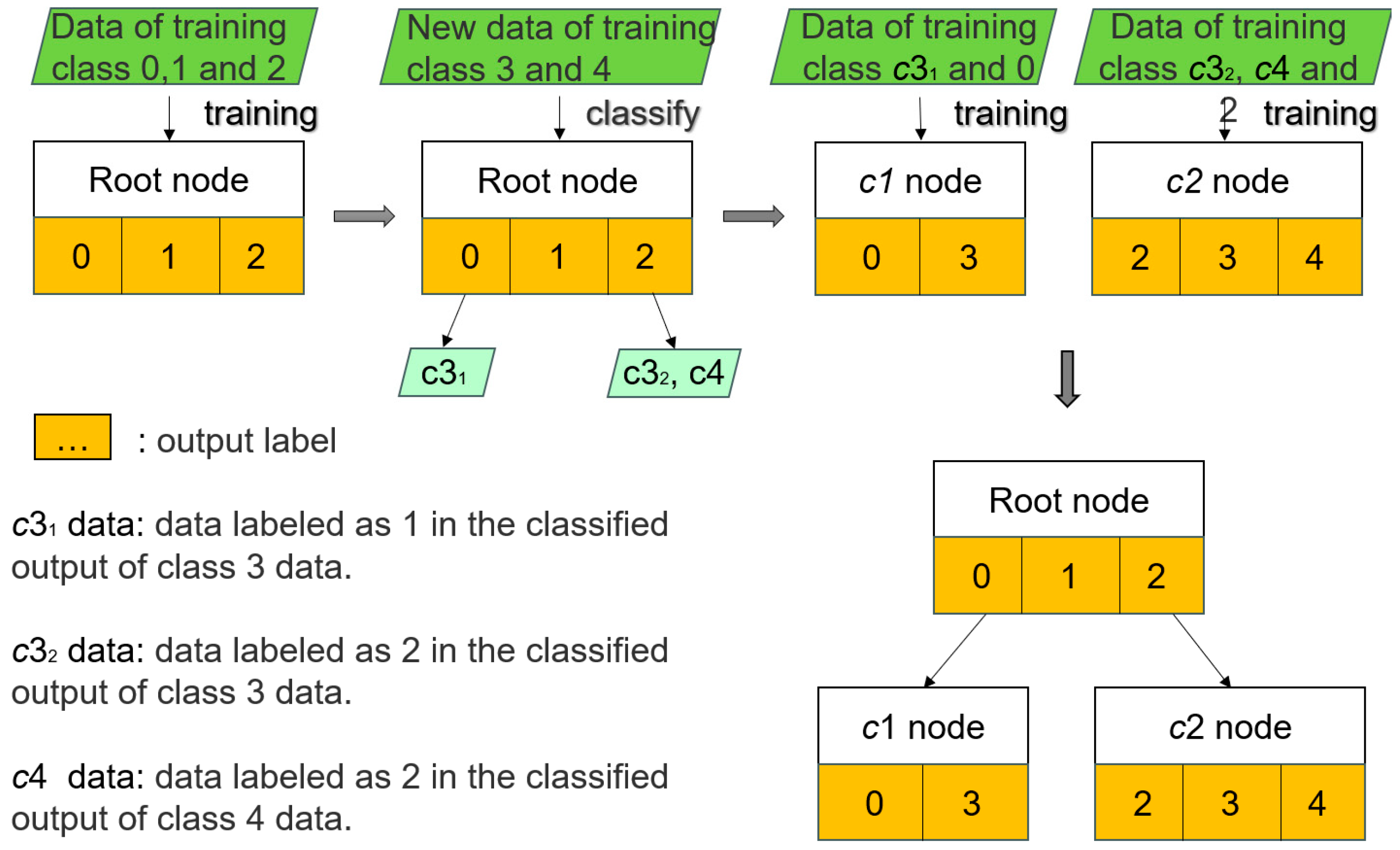 into the root node classifier for classification. Because the root node classifier is trained based on old data, it will misclassify new data into one or more existing classes. For example, in the second part of