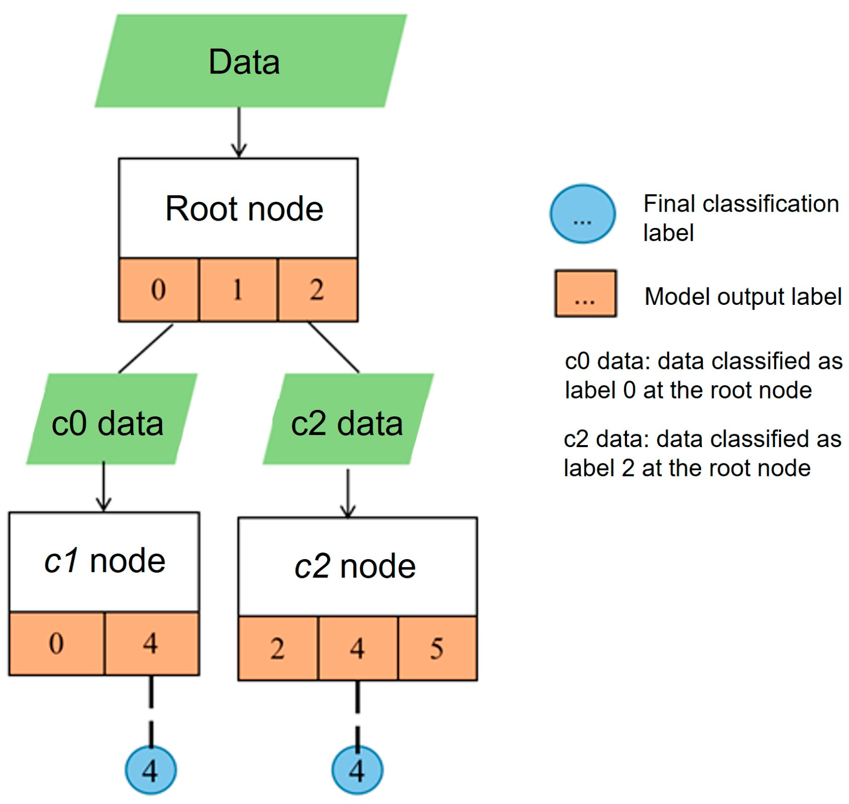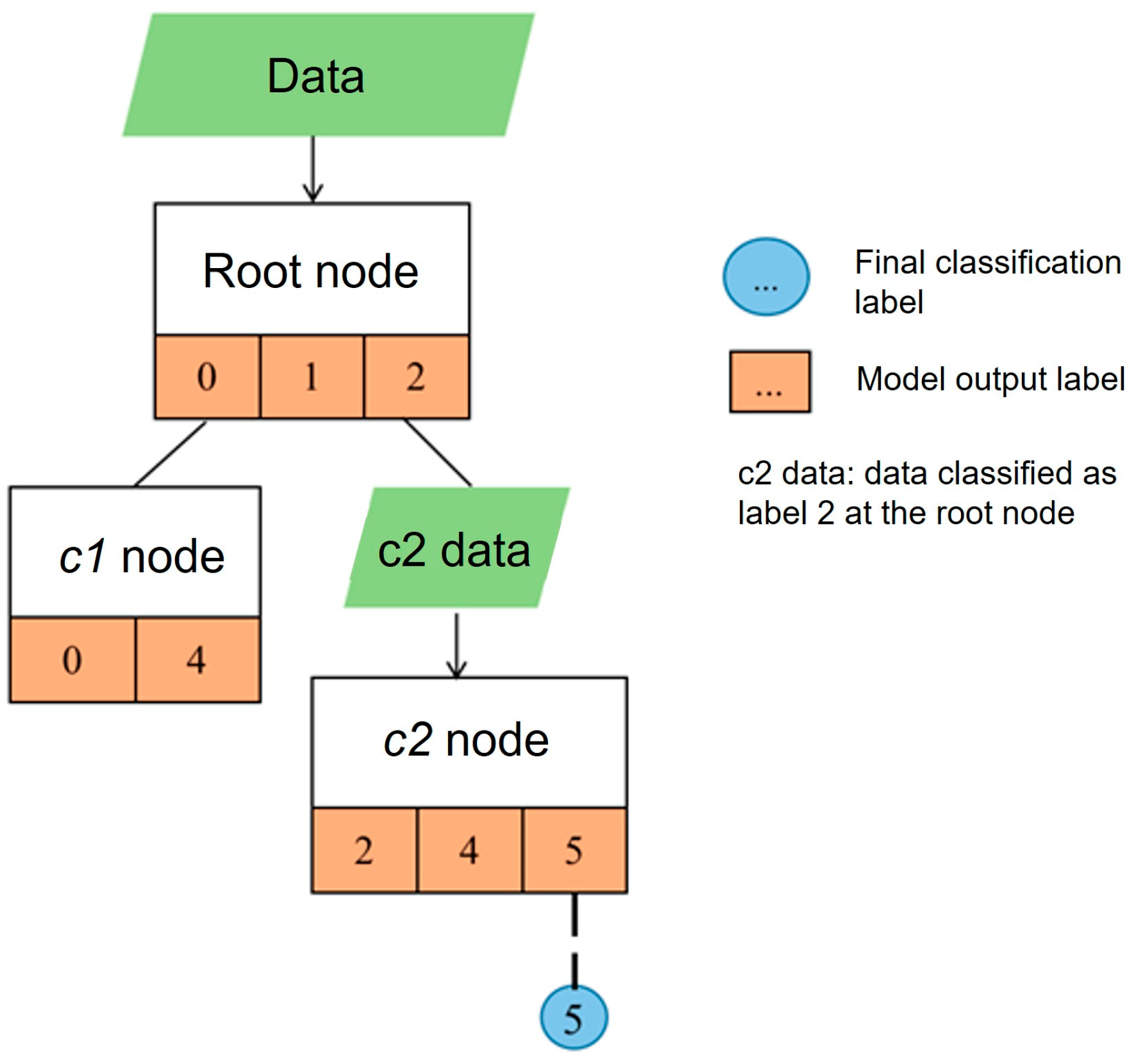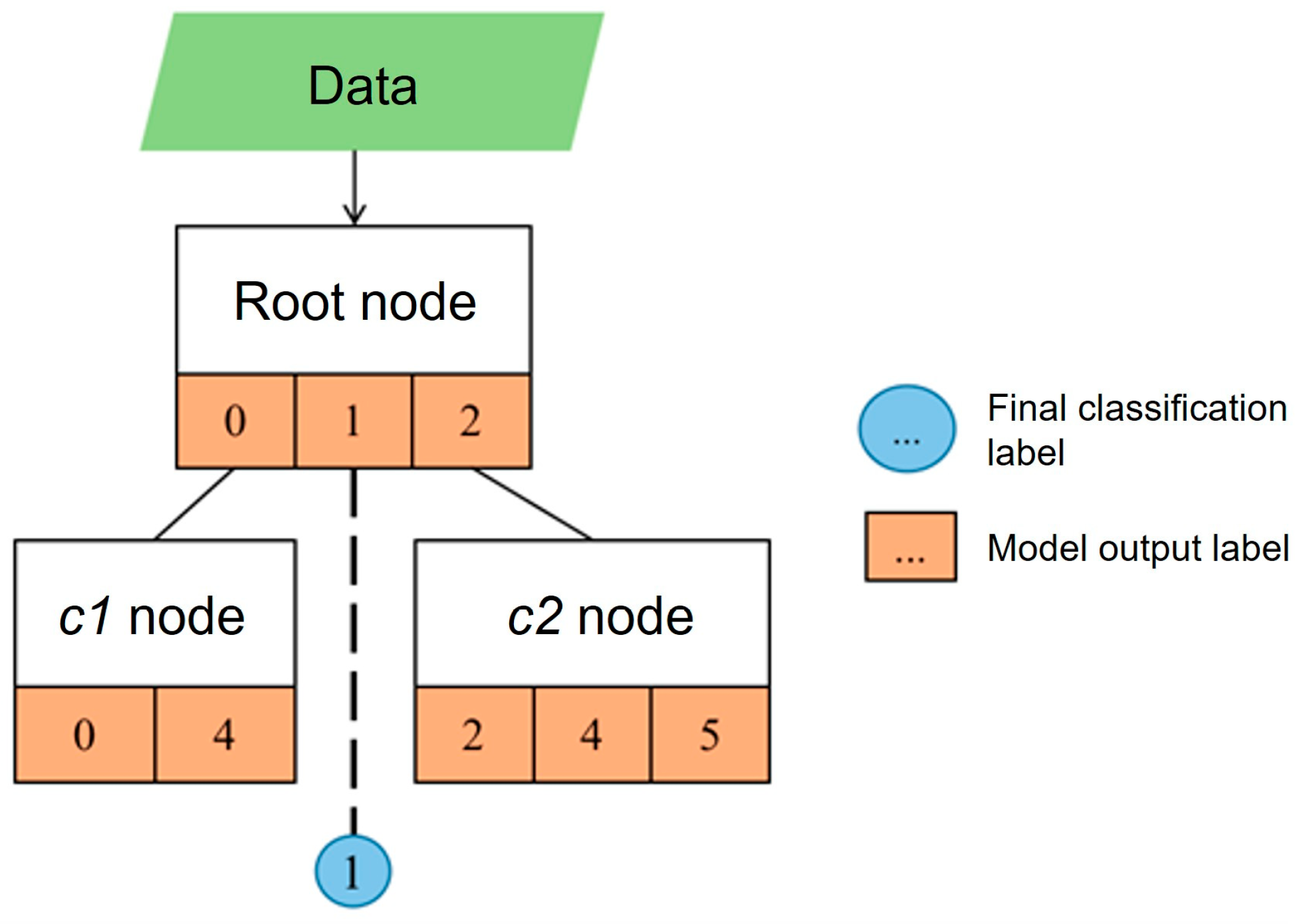 Figure 5. When new data needs to be classified, it is first input to the root node for prediction. If the label output by the root node is not connected to any child node, then the label is the final classification result of the data; If the label is connected to other nodes, the data will continue to be input to the connected nodes for prediction, and so on recursively until the label corresponding to the prediction result is not connected to any node. For example, for the updated model, the input data
