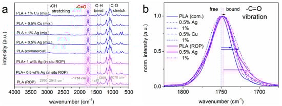 The ATR-FTIR results are presented in Figure 1a for all PNC compositions. We recall that the data correspond to samples in the amorphous state. Due to the small NP amount, the signals are dominated by the bond vibrations originating from the polymer (e.g., C-H, C-O, -C=O), as expected. The recorded spectra herein are in accordance with those of previous materials based on PLA [].