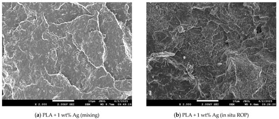 The filler dispersion throughout the polymer matrix was examined by SEM. The representative images for all samples can be seen in Figure S1 of the Supplementary Materials. Figure 2 shows comparatively two PNCs filled with 0.5% Ag but prepared, on the one hand, by mixing (Figure 2a) and, on the other hand, by in situ ROP (Figure 2b).