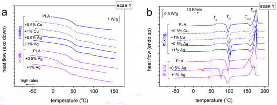 The attention is now turned on the thermal transitions, beginning with the DSC results by scan 1, which are presented in Figure 3. Scan 1 involves the melting and fast cooling (Figure 3a) of the samples. These aimed at the suppression of the crystallization and, subsequently, the study of the glass transition with the polymers preserved in the amorphous state. Consequently, any recorded effects on the glass transition and the cold crystallization (heating scan, Figure 3b) are considered to directly arise from the presence of the NPs.