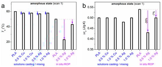 In the mixing-based PNCs, which were prepared employing the commercial PLA, the presence of NPs, although at very low loading, affects the Tg. More precisely, the Tg of PLA (60 °C) drops by 2–3 K (57–58 °C, Figure 4a). The strength of the glass transition, represented by Δcp, equals ~0.50 (±0.02) J/g∙K in commercial PLA and barely changes in the PNCs (Figure 4b).