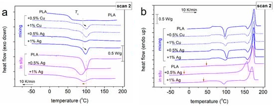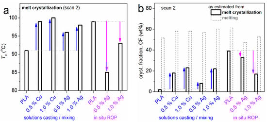 In Figure 6, one can follow two distinct behaviors regarding crystallization. For the mixing-based PNCs, the Tc of PLA (91 °C) increases in the PNCs by 5–9 K, whereas CFc increases significantly from 2 wt% (commercial PLA) to 8–23 wt%. The effects become stronger monotonically with the filler amount increase, while the effects of Cu NPs are slightly stronger than those of Ag NPs. It is quite clear from these data that the NPs favor nucleation and the crystalline fraction. Most probably, Cu and Ag play the additional role of nucleating agents [,,,]. This is quite expected for such nanofillers when there are no strong interfacial interactions involved [].
