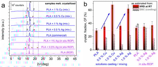 (a) Comparative XRD spectra for all samples, previously subjected to melt-crystallization. The added vertical dash-dotted lines and horizontal arrows are used to mark the peak 2θ alternations recorded for the PNCs as compared to neat PLAs. (b) Crystalline fraction, CF, for all samples as estimated by XRD at DSC.