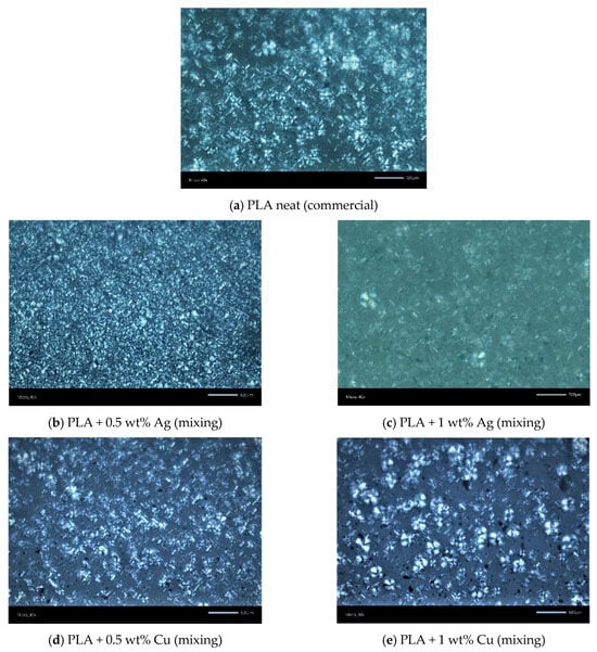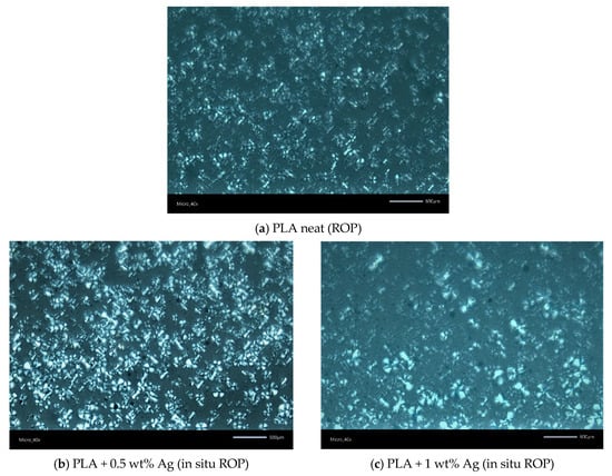 The PLM results are shown in Figure 8 for the mixing-based PNCs and in Figure 9 for the ROP-based PNCs. They partly confirm the previous findings by DSC and XRD. In particular, compared with the neat commercial PLA, for the PNCs, and especially in the cases of 0.5% Ag and Cu, the number of the formed crystallites is greater and the semicrystalline morphology is denser. Thus, both the facilitated nucleation and CF are confirmed. In the ROP-based PNCs, the semicrystalline morphology is quite similar between the polymer and the PNC with 0.5% Ag. On the other hand, fewer crystallites and sparser semicrystalline morphology are recorded for 1% Ag, again in qualitative agreement with the previous techniques.