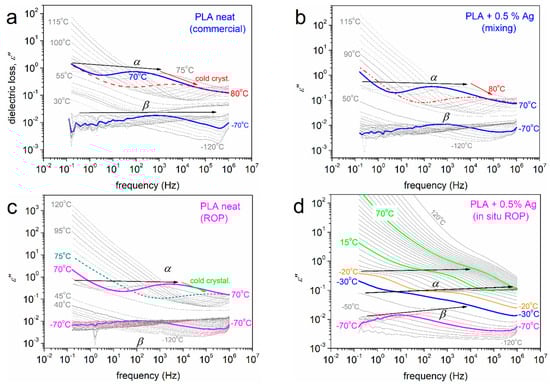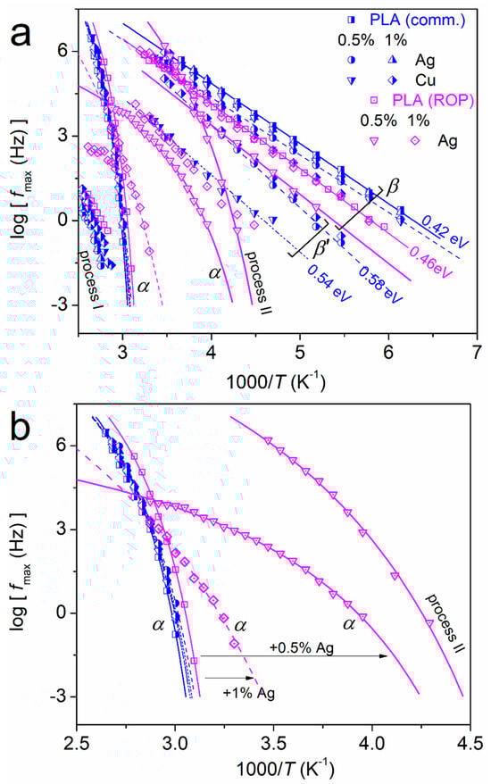 Beginning with the faster dynamics, β relaxation (ester group dipolar relaxation) is recorded at all cases. Due to its local character, its time scale in Figure 13a is linear, obeying the Arrhenius law []. The estimated activation energy equals 0.42–0.46 eV, being slightly higher in the ROP-based systems. For these systems, polymer and PNCs, β is located at higher temperatures/lower frequencies and, thus, ‘exhibits slower dynamics’, as compared to the mixing-based systems. For both systems, there seems to be a general tendency of β to become slower (decelerated) in the PNCs, with the effect being slightly stronger in the PLA + 0.5% Ag (ROP). These effects are compatible with the formation of interfacial interactions, within which a fraction of the ester groups is involved.