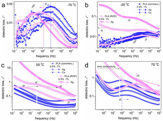 Comparatives BDS ε”(f) curves for all samples, at the selected temperatures (a) −70 °C beta, (b) −20 °C, (c) 55 °C and (d) 70 °C to focus on the local (β, β’) and segmental (α) relaxations/peaks.