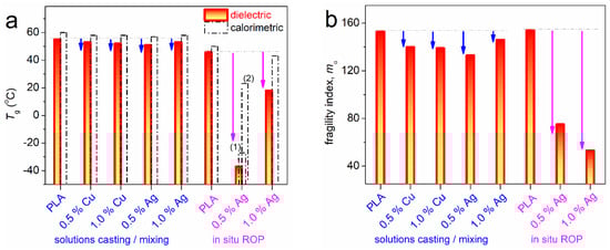 From the time-scale data of Figure 13 and upon proper fixing of the VFTH preexponential factor as 1013 Hz (phonon frequency) [], two critical values were estimated. First, the dielectric glass transition temperature, Tg,diel, was estimated [,,,] and, second, the fragility of α relaxation, mα []. The composition dependence of Tg,diel is shown in Figure 14a alongside that of the calorimetric Tg. The results are qualitatively similar between the two techniques, despite any expected qualitative discrepancies []. In all cases, the presence of NPs leads to a drop of Tg, with the latter being severe in the in situ-ROP synthesized PNCs.