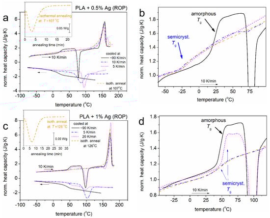 Interestingly, the corresponding effects in the ROP-based PNCs are significantly stronger. Neat PLA exhibits a lower Tg of 50 °C which is strongly suppressed in the PNCs, i.e., down to the surprising values of 23 °C and 43 °C for 0.5% and 1% Ag, respectively (Figure 4a). The values were confirmed by additional measurements on the same as well as fresh samples. The effects on Δcp were found to be strong as well (Figure 4b). The Δcp of neat PLA-ROP [0.54 (±0.02) J/g∙K] was decreased to 0.23 and 0.50 for 0.5% and 1% Ag, respectively. Δcp is actually the measure of the mobile amorphous polymer fraction (MAF) that contributes to the glass transition process [,]. The reduction of Δcp indicates the partial immobilization of polymer [], most probably of the polymer chains in the NPs-PLA interfacial layer/zone. This polymer zone is considered to be formed by amorphous rigid polymer chains, i.e., the so-called rigid amorphous fraction (RAF), and is estimated by the % reduction in MAF [,]. In our case this RAF is estimated as ~20 and ~7 wt% for 0.5% and 1% Ag, respectively. The results provide additional evidence for the existence of strong interfacial interactions in the case of the ROP-based PNCs; this provides support to the findings by FTIR (Figure 1b) as discussed in the previous.