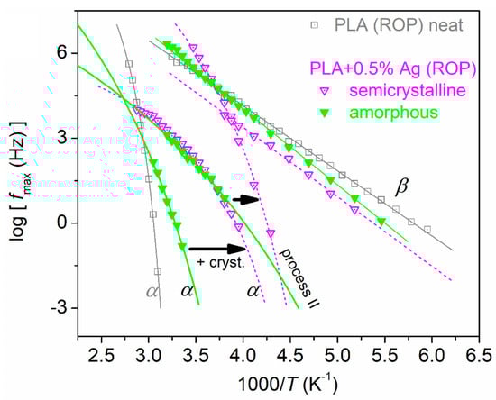 In PLA + 0.5 Ag (ROP), an additional process could be resolved. This is the case of process II in Figure 13. The process was necessary for the sufficient fitting of the spectra. Judging from its time scale position (close to Tg) and its VFTH trend, one would propose that the process is another type of α relaxation. This option cannot be excluded totally, however, as there are opposite facts to this. For example, the extrapolation of its time scale to the very high temperatures results at extremely high frequencies, which is not expected for pure segmental relaxation. The relaxation is symmetric and quite narrow, whereas its dielectric strength is low. The relaxation was recorded in more than one sample of the same composition. The molecular origins of this relaxation can only be speculated. For example, it could be some kind of ‘precursor’ relaxation of segmental relaxation []. Yet, such relaxation has not been reported for PLA. Thus, this issue is open and needs further investigation.