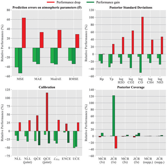 We categorize all experimental configurations into those trained on realistic transmission spectra versus those trained on ideal spectra. The right-most bars in Figure 1 present the performance comparison of the former through relative percentage changes relative to the latter, quantifying the influence of realistic spectra in training and evaluation of CNFs. First of all, the use of realistic spectra leads to significant declines in atmospheric parameter predictions, with increased errors across MSE, MAE, and RMSE (average increments varying from to ). As expected, perturbed observations challenge precise parameter estimation, inducing less precise and confident predictions. In fact, similar considerations can be carried out on notable performance drops in uncertainty estimation (average increments varying from to for planet temperature and carbon monoxide log-abundance, respectively). Only the planetary radius is not marked by a performance drop in uncertainty estimation. Again, the behavior of calibration metrics is inconsistent. While quantile and variance calibration improve by registering average decrements of , , and for QCE (univariate, multivariate) and ENCE, respectively, we also register a performance drop for Pinball loss and UCE (average increment of and , respectively). Also, sample quality worsens as measured by the average increment of and of NLL measurements in the univariate and multivariate cases. Coverage metrics remain stable except for JCR at with an average decrement of . These findings highlight a reduction in robustness, with noisy observations producing qualitatively less precise predictions and poorly calibrated confidence intervals, and quantitatively reflected in increased prediction errors and reduced coverage rates.