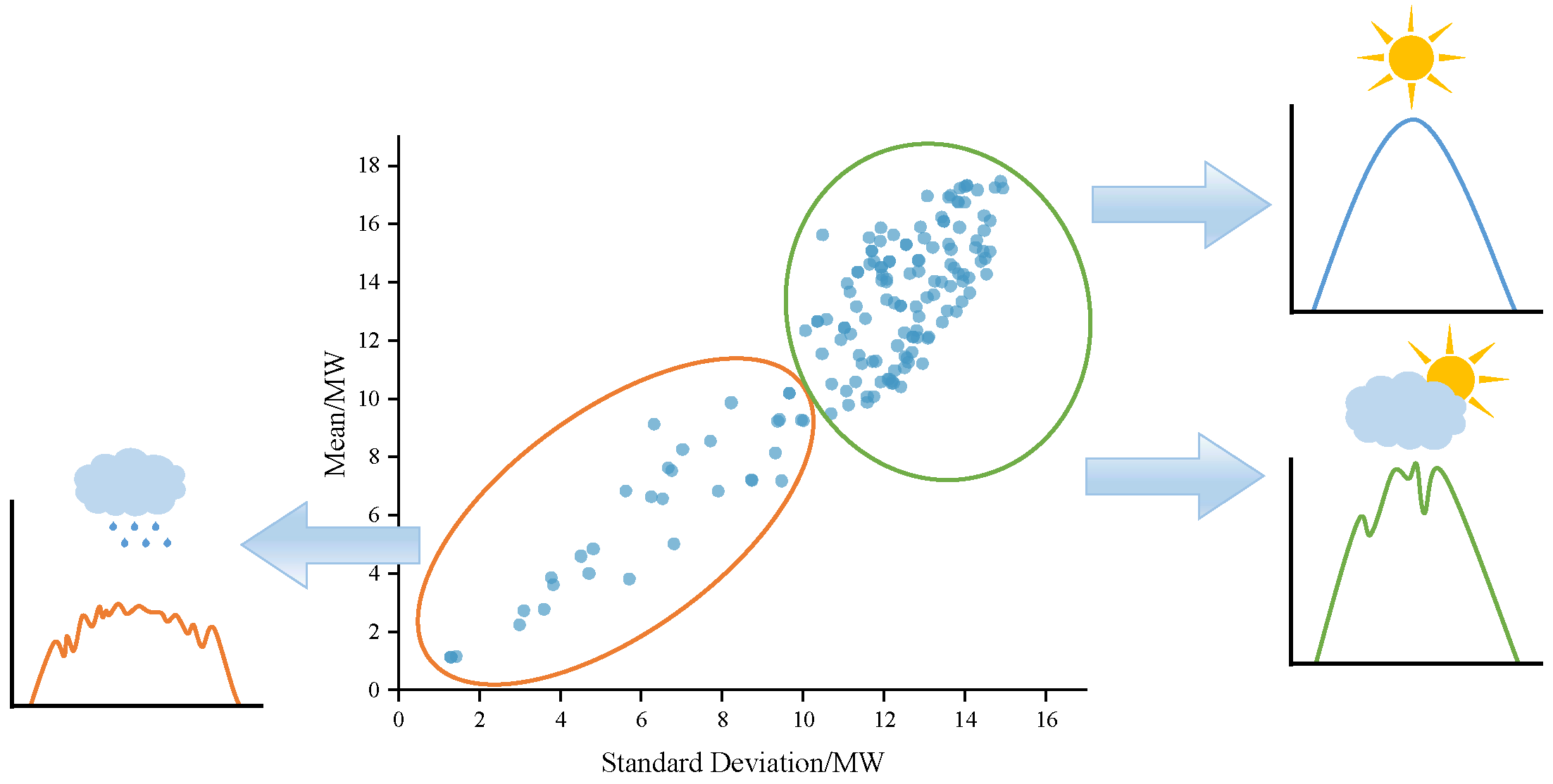 Figure 1, in the scatter plot of PV power mean and standard deviation, the mean values of both sunny and cloudy days are similar, and the standard deviation of cloudy days is slightly larger than that of sunny days, but it still cannot effectively separate sunny days and cloudy days.