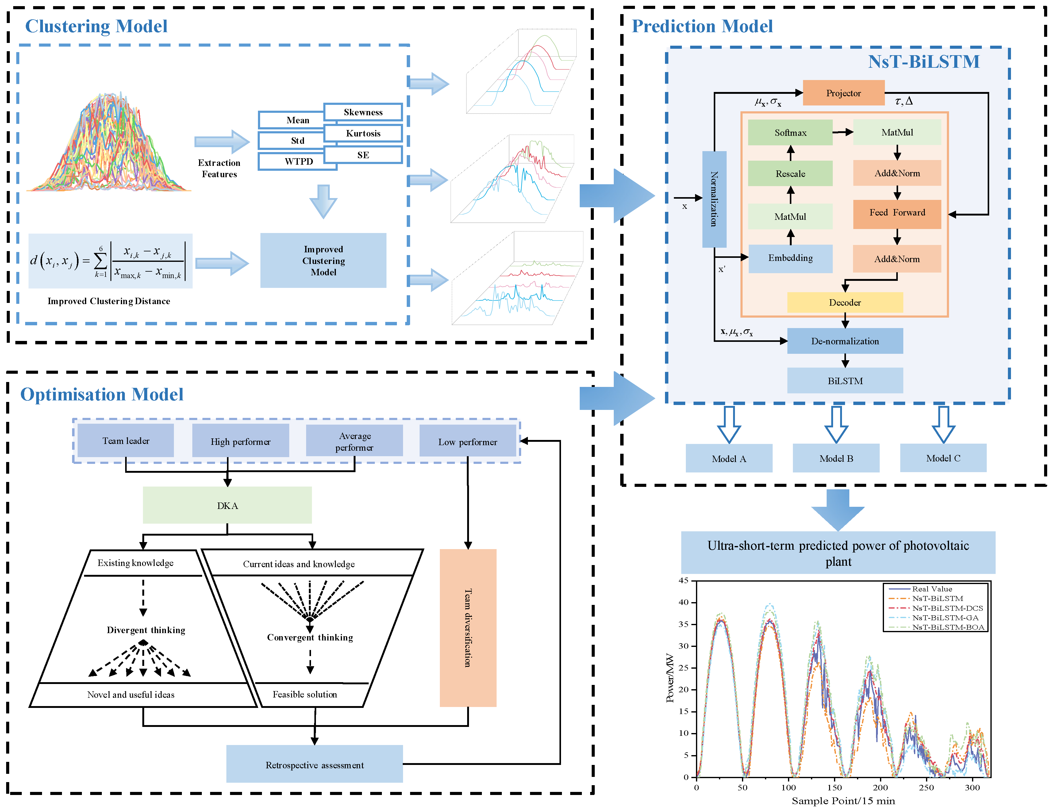 Aiming at the slow convergence and insufficient generalisation in high-dimensional parameter space optimisation, a new intelligent optimisation algorithm, DCS, is introduced for updating and adjusting the key hyperparameters of the composite prediction model and accelerating the convergence of the locally optimal region in order to improve the prediction performance. A combined model based on the NsT-BiLSTM-DCS model is proposed to solve the problem of poor adaptation of the traditional Transformer to non-stationary sequences and to enhance the capability of capturing the power change features triggered by cloud transients.