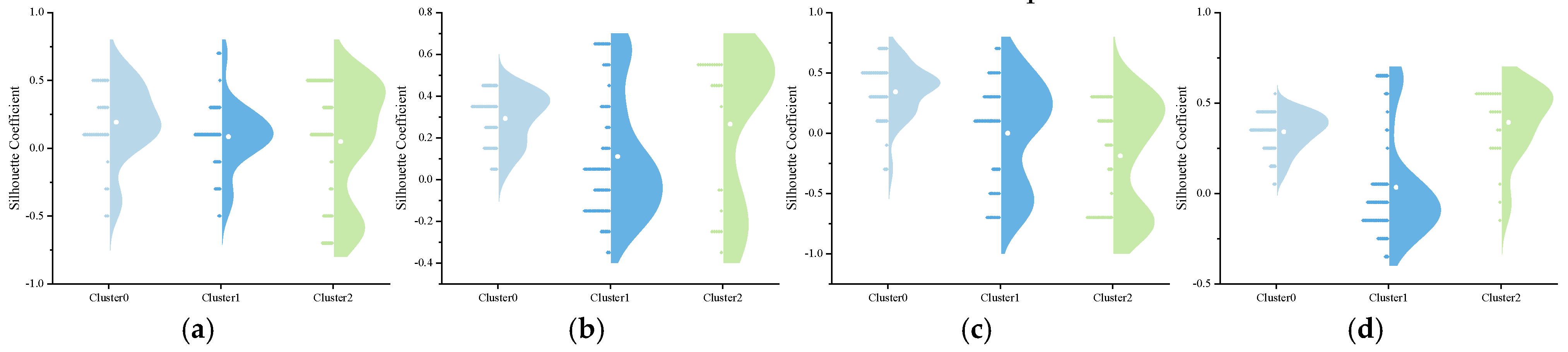 To clarify the ranking of the significance of each feature’s contribution to clustering performance, this study employs the one-way analysis of variance (ANOVA) method to conduct a quantitative analysis of the clustering contribution degree of each feature index. Within the ANOVA analytical framework, the F-value is used to quantify the significance of differences in a single feature across different clustering categories: a larger F-value indicates a higher ratio of the feature’s inter-cluster differences to its intra-cluster differences, which in turn means stronger discriminative ability for clustering category boundaries and, correspondingly, a higher contribution degree to the clustering results. The specific calculation formula of the F-value is presented as follows: