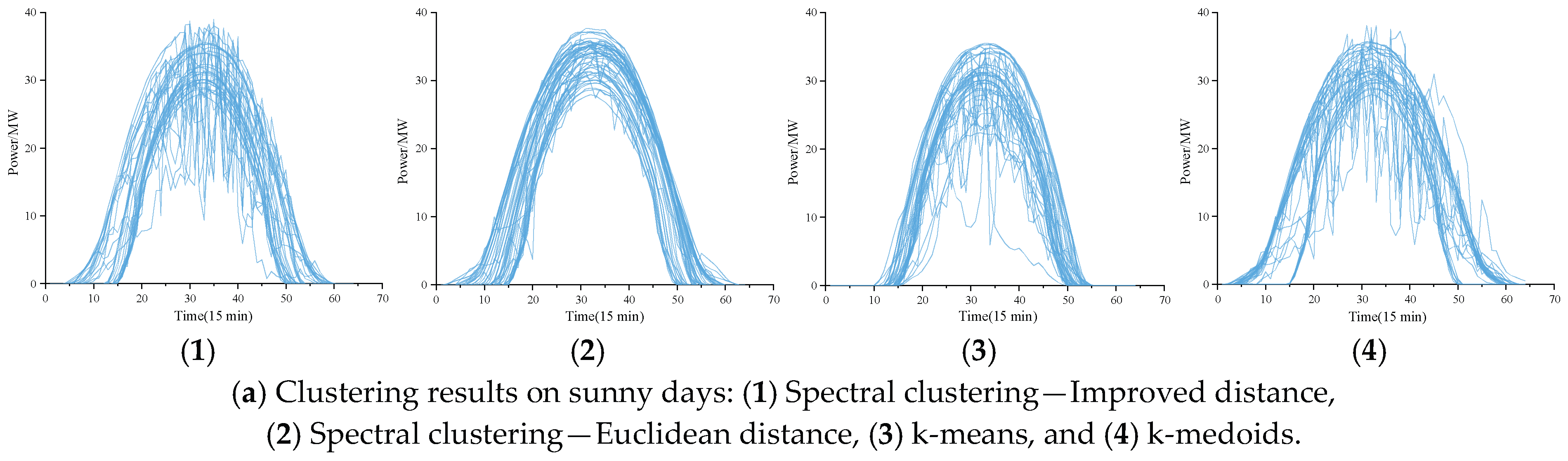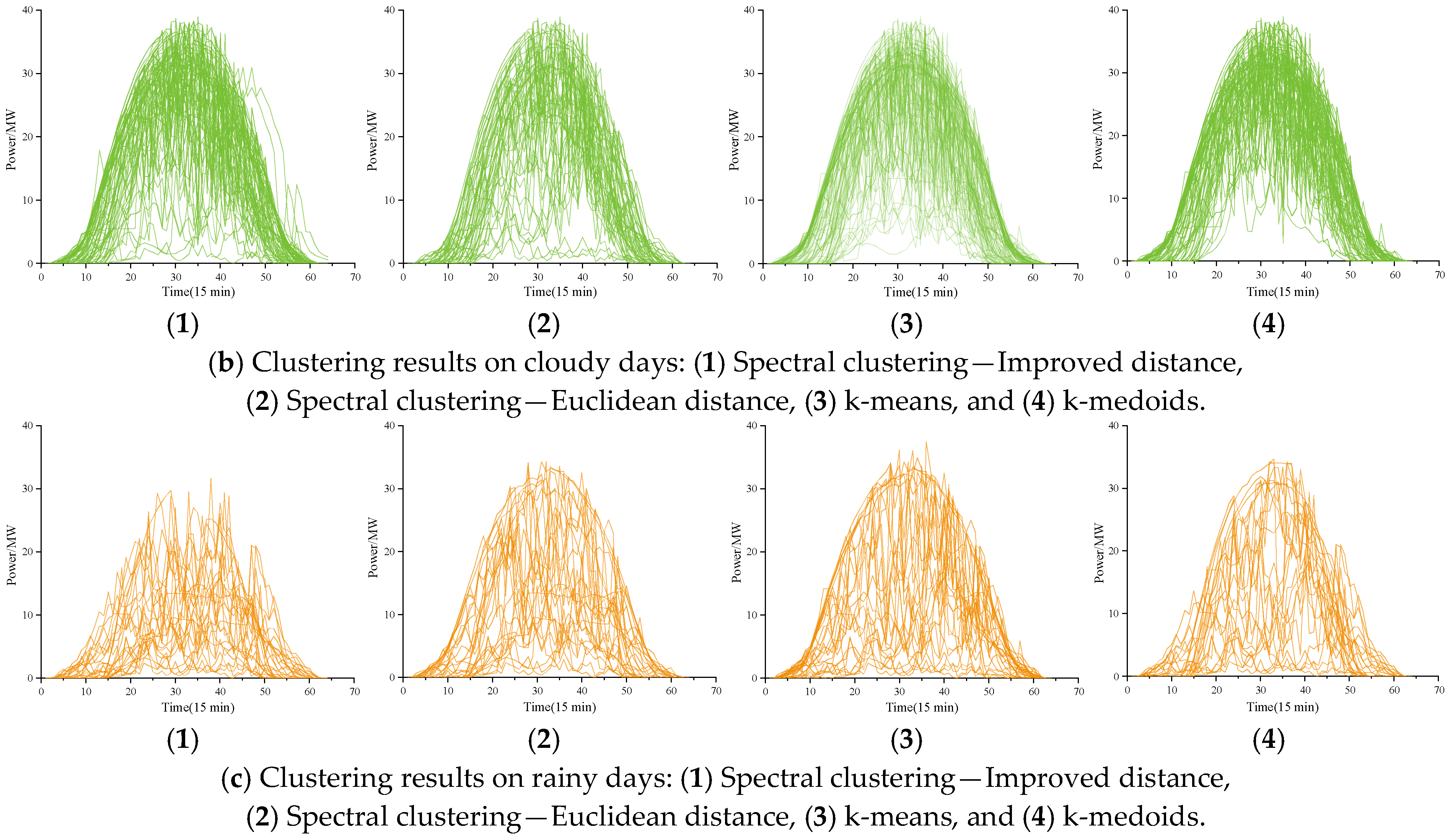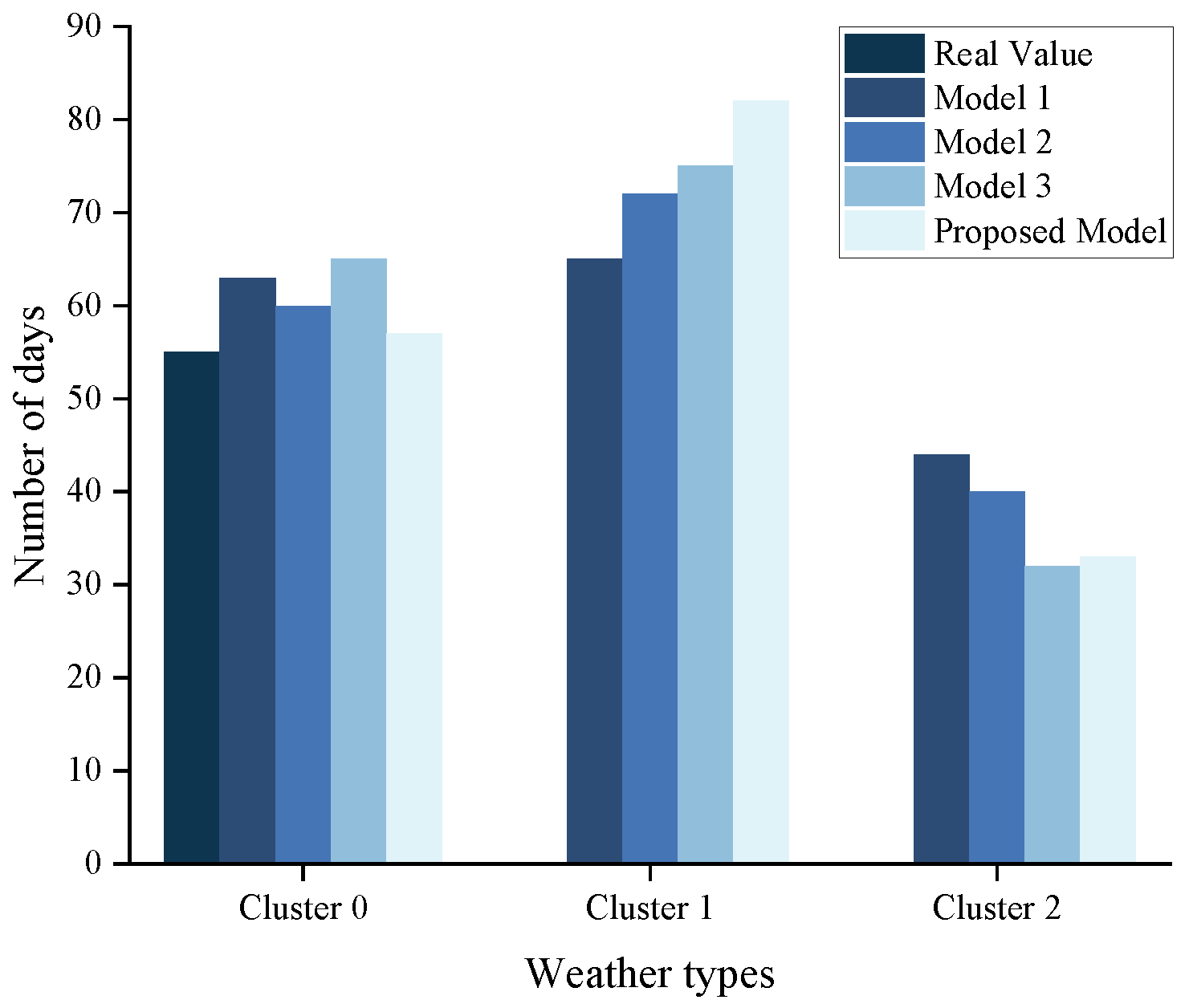 The improved clustering distance proposed in this study effectively filters the sunny, cloudy, and rainy day samples into corresponding clusters. In this study, Cluster 0 represents the sunny-day results, Cluster 1 represents the cloudy-day results, and Cluster 2 represents the rainy-day results.