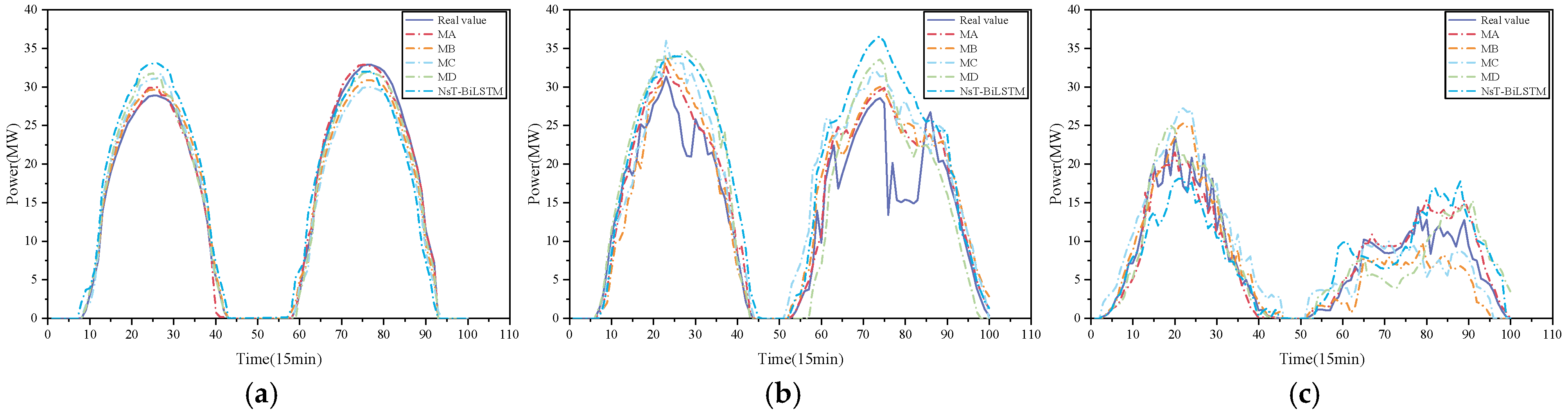 Table 3. The experiments show that the MA model proposed in this paper achieves the best overall prediction results on this dataset in combination with the NsT-BiLSTM model, which indicates that the improved distance metric can capture the nonlinear fluctuation characteristics of the meteorological data more accurately and effectively improve the clustering quality. The average errors of all clustered models are 0.0132 and 0.0153 lower than those of the unclustered benchmark model, which verifies the effectiveness of the ‘clustering before prediction’ strategy in modelling complex weather patterns. Under clear-sky conditions, the MA and MB models are able to effectively capture the power time-series characteristics due to the small fluctuations of irradiance, cloudiness, and temperature, and their prediction accuracies are significantly better than those of the other models. However, under non-sunny conditions, the prediction is made more difficult by intermittent meteorological fluctuations, and the prediction errors of all models increase. Among them, the prediction based on the clustering model proposed in this paper still maintains the optimal performance, and its MAE and RMSE are reduced by 0.0304 and 0.0316 on average compared with the unclustered model.