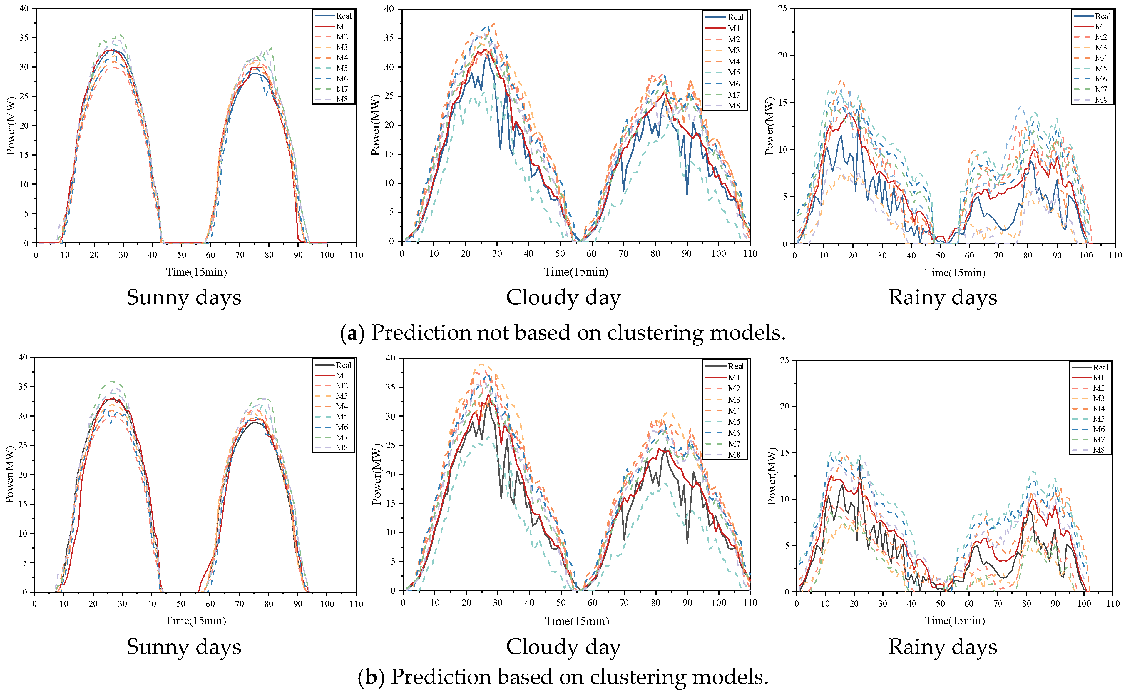 In order to verify the applicability of the proposed method in PV power prediction for different weather types, this paper comparatively analyses the PV power prediction performance from M1 to M2, comparing each prediction method based on the clustering model and not based on the clustering model, as shown in