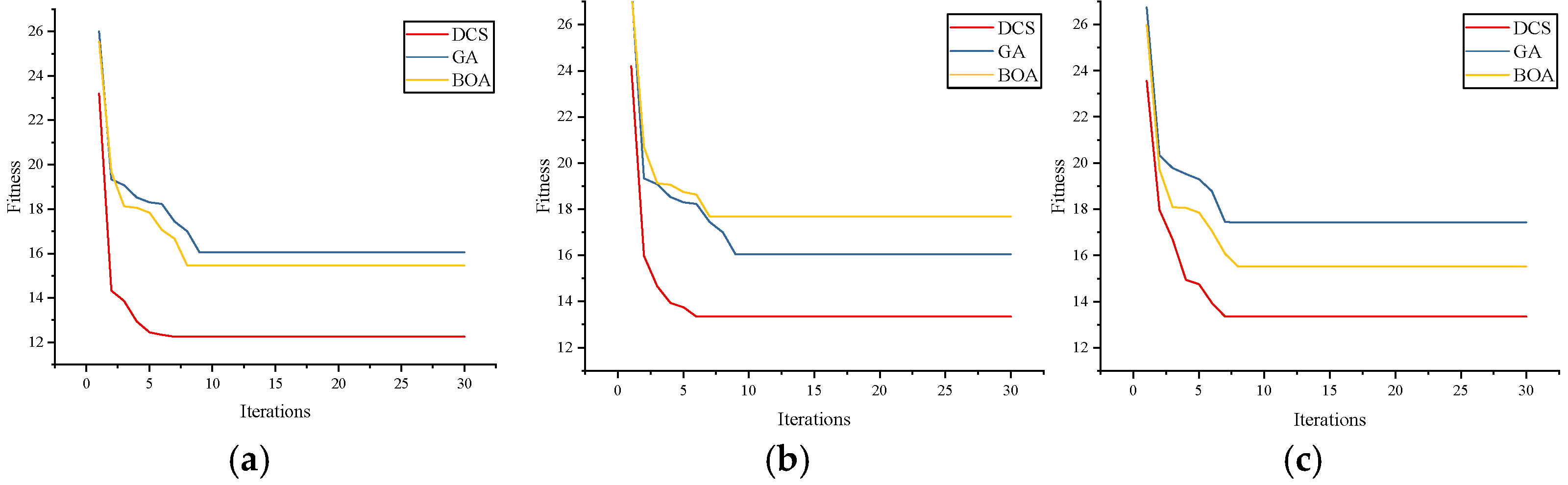 Figure 9, which shows that the DCS algorithm can complete the main optimisation task within 7 iterations, while BOA and GA require nearly 10 or more iterations to achieve lower loss values. In each case, the optimisation algorithms proposed in this paper corresponds to significantly lower fitness values than the other compared algorithms.