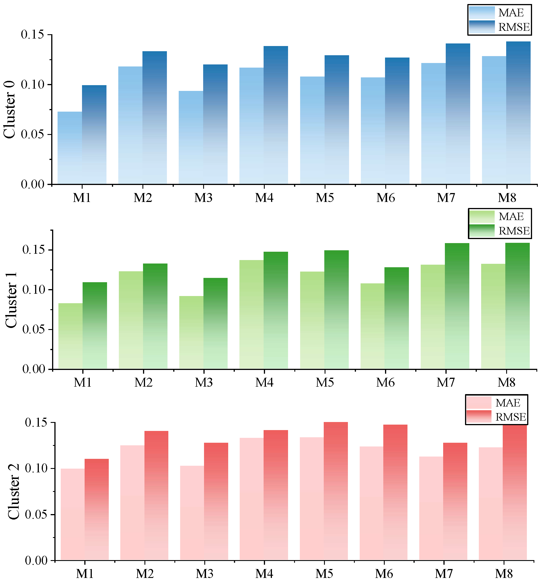 Based on the clustered PV data, each model is trained and predicted, respectively, and MAE and RMSE are used as the evaluation metrics. The specific results are shown in