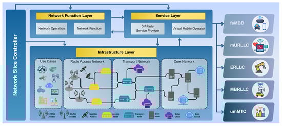 A critical technology enabling this transformation is network slicing. Network slicing was established during the 5G era but will play an even more critical role in 6G [,]. This technology works by creating virtualized end-to-end logical network slices on shared physical infrastructure. Each slice is specifically customized to meet the unique requirements of different application types. The key advantage is that multiple virtual networks can operate simultaneously on the same shared infrastructure, enabling efficient and dynamic resource allocation []. The result is maximized resource efficiency through isolation of critical data flows.