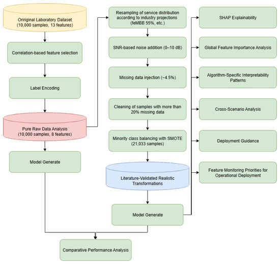 Our approach builds upon the 6G network slicing dataset (10,000 samples; 13 features) introduced by Botez et al. [], extending it through systematic refinement and realistic transformation processes. Figure 3 illustrates the complete methodology workflow encompassing feature optimization, dual-path evaluation, and comprehensive algorithm assessment.
