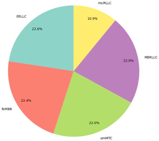 where encompasses correlation-based feature selection and label encoding. Label encoding maps categorical attributes to integer values, fitted exclusively on training data to prevent leakage while preserving structural characteristics. Figure 5 shows the approximate class balance maintained, with four slice types exhibiting near-uniform distribution (22.0–22.6%) and mURLLC showing lower representation (10.9%).
