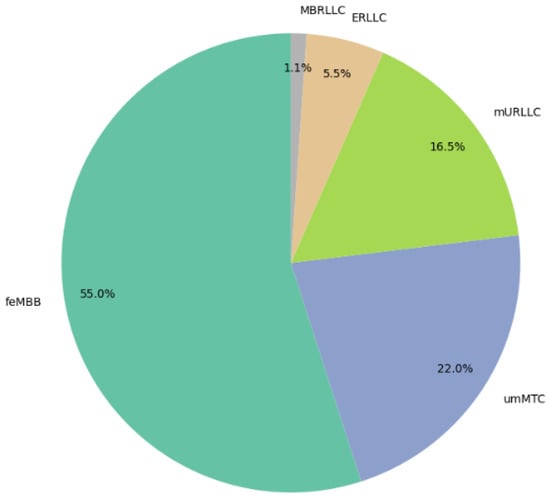 Real-world 6G networks exhibit severe class imbalance based on comprehensive industry projections from flagship research initiatives [,]. The realistic distribution applies market-driven allocation: