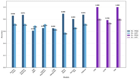 Two distinct experimental regimes are considered: PRDA represents a controlled baseline environment with minimal noise and well-structured data, while LVRT incorporates congestion modeling, multi-layer noise, missing data, and temporal correlation patterns, thereby mimicking actual 6G deployment conditions. This contrast allows analysis of model performance when transitioning from theoretical laboratory conditions to realistic field operations.