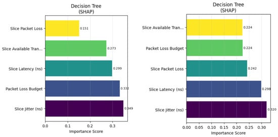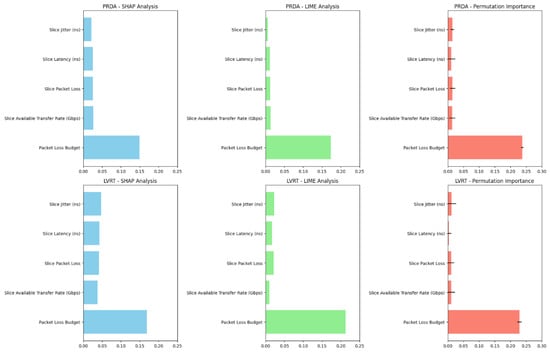 Explainability for Network Slicing Classification: Network slicing is central to 5G/6G, allowing virtual networks with different QoS profiles. ML models are used to automate slice classification and allocation. XAI ensures that these decisions are transparent, revealing which features (e.g., latency, packet loss, and device type) drive classification outcomes []. This transparency builds operator trust, supports compliance with service-level agreements, and allows auditing for fairness or bias. For example, SHAP-based analysis can show that high packet delay and video traffic type were decisive in routing a flow to a low-latency slice.