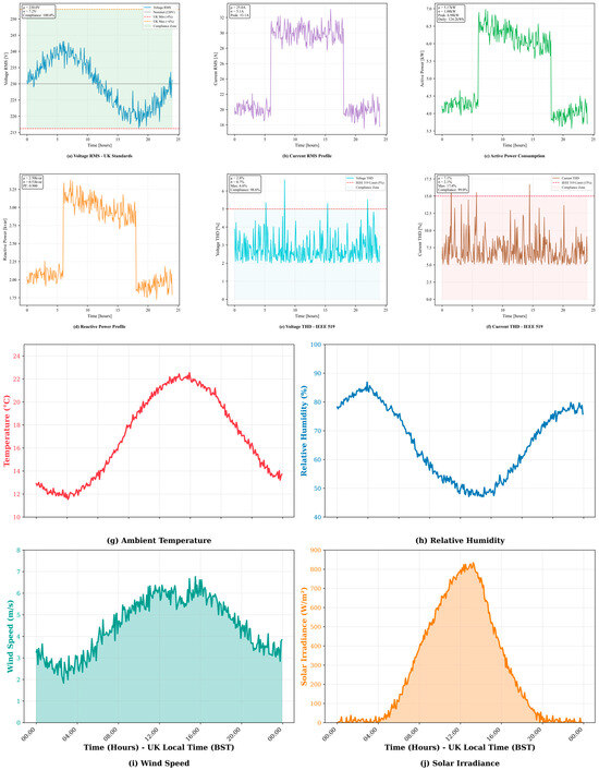 The 2011 data used in this work are still suitable because of the high-resolution and in-depth measurements of the residential power quality parameters and climate variables within several days, which reveal the variability in the real world and momentary terrestrial power quality phenomena necessary for testing the hypothesis of the proposed climate-adaptive model of energy management. This allows the dataset to obtain complete coverage of voltage/current RMS, total harmonic distortion, power factor, and climatic conditions, including temperature and solar irradiance, and thus can be extensively used in the analysis and prediction of such conditions that would be of significance in energy systems included in residential buildings today as well as in the future when applied along with climate-sensitive machine learning and optimization techniques. Figure 1 illustrates the time-series behavior of PQ and climate variables for 3 June 2011.