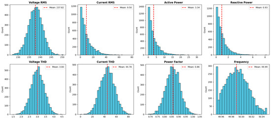 Residential power data is comprehensive when thoroughly analyzed and provide information on the load behavior and power quality. Its active power consumption had a mean of 2.14 kW and a standard deviation of 1.87 kW, resulting in a high coefficient of variation of approximately 0.87, indicating significant variability, which is why demand response strategies can be applied. The maximum demand was 8.45 kW, which is almost four times the normal value, indicating a significant variation in domestic energy consumption during the study period. The power factor was 0.824, indicating an efficient use of energy, although it could sometimes be as low as 0.651, possibly due to reactive loads. The voltage THD was comparatively low, at an average of 2.9%. However, the current THD was significantly higher, at an average of 45.7%, indicating a substantial harmonic content in the current waveform, which is typically caused by nonlinear residential loads. The system frequency was very stable at 49.99 ± 0.1 Hz, and the voltage RMS was well-controlled, with an average of 237.8 V. These observations highlight the efficiency constraints and variability of residential energy demand, which are pivotal for optimizing grid and distributed energy resource planning in the future. A distribution overview of the key power-quality and load parameters is provided in Figure 2.
