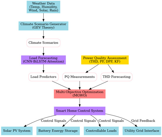 This section elaborates on a combined scheme for climate-adaptive residential energy management. The methodology employs an advanced forecasting model integrated with a multi-objective optimization engine to balance economic cost, user comfort, and power quality while considering various climatic conditions. The general workflow from ingestion to data optimization is illustrated in the following schematic. The proposed climate-adaptive residential energy-management architecture is shown in Figure 3. The climatic data variables were down sampled and adjusted to suit the power-quality database 5-min timescale. Unification based on timestamps and ensuring the filling of gaps with forward-filling were used for the time variables.