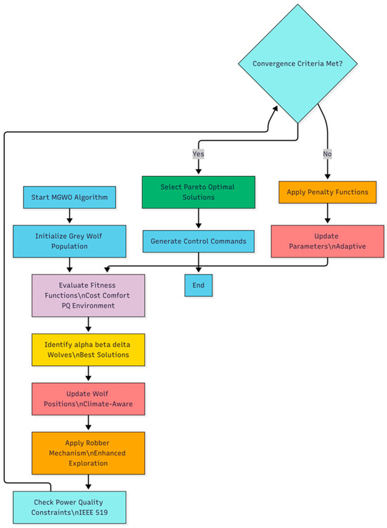 The current literature lacks detailed schemes that combine high-level algorithms (convolutional neural networks (CNN) combined with bidirectional long short-term memory units (BiLSTM) and attention mechanisms) and superior metaheuristic optimization (modification of the grey wolf optimizer) to manage residential climate-adaptable energy consumption. The combination of CNN and BiLSTM models in energy with an attention mechanism in household applications related to climate has not been previously studied. Similarly, although the GWO has been proven to be effective in the optimization of a power system, its modification and application to a multi-objective optimization scheme in residential energy control under power quality factors is a novel contribution to the literature.