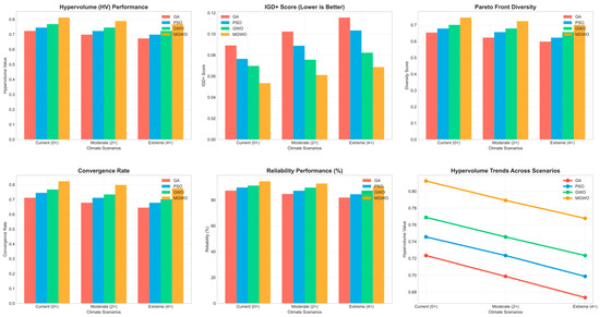 The proposed framework integrates CNN-BiLSTM-attention forecasting with robust multi-objective optimization to deliver the best performance compared with that of individual techniques. The mentioned model achieved up to a 25% RMSE reduction compared with the persistence-based line and approximately 5% with the LSTM, and also remained stable under the +2 °C and +4 °C warming scenarios with narrow confidence intervals. In the optimization section, the MGWO outperformed the GA, PSO, and standard GWO by converging 20% faster, having 94.5% reliability, and improving the Pareto front diversity by 15–20% with the help of a chaotic map parameter that updates the balanced exploration in dynamic climate conditions. At the system level, a 37–41% reduction in V1_THD was achieved while maintaining IEEE 519 compliance, a 3.3% improvement in the power factor, a 15.8% reduction in reactive power demand, and a 33.3% decrease in voltage imbalance. These advances translated into tangible environmental and economic benefits, which reduced GHG emissions by 44.5%, approximately 45% in peak demand reduction, a 45% increase in renewable energies, and an NPV of USD 4267–USD 5000 with payback periods as short as 3.2 years.