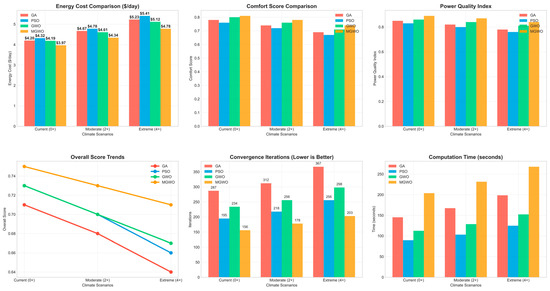 In this study, we developed and validated a climate-adaptive residential energy management framework that combines high-accuracy CNN-BiLSTM-attention forecasting with the MGWO for multi-objective control in residential buildings. The framework was designed to simultaneously optimize the economic cost, power quality, occupant comfort, and environmental performance by utilizing adaptability to normal and climate-altered conditions.