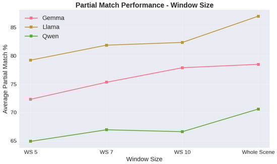 Increasing the context window generally improves performance for all models, with the most notable gains occurring when moving from WS 10 to the whole scene. An exception is Qwen, which exhibits a slight decrease in performance when moving from a window size of 7 to 10. Overall, these results suggest that larger context windows enhance both recall-oriented (partial match) and precision-oriented (exact match) retrieval.