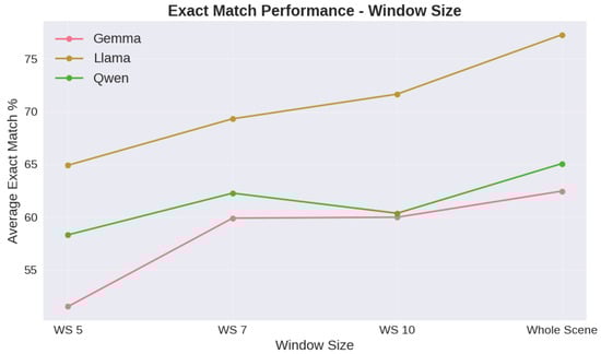 Performance comparison reveals a consistent improvement with larger context windows. To address potential outlier concerns, we perform a comprehensive robustness analysis. Table 8 summarizes the mean for exact matches per model and window size.
