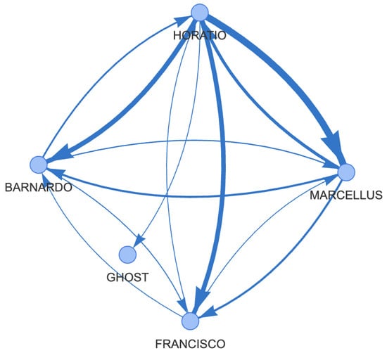 Franco Moretti [1] pioneered the application of network theory to plot analysis, exploring how connections between characters (nodes) reveal narrative patterns. In Franco Moretti’s more recent studies [17,18], the social networks are based on an algorithm that models the dramatic dialogue as a probabilistic network, where characters take turns speaking, with each speaker selection influenced by a “Centrality” parameter that accumulates advantage for frequent speakers, gradually creating hierarchical distinctions.