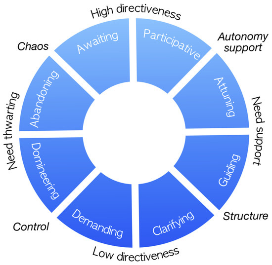 In this context, the present study is grounded in the circumplex model of motivational teaching styles see Figure 1. This model has been proposed within the framework of Self-Determination Theory (SDT) [2]. This circumplex approach posits that teaching styles are not rigid categories but rather fall along a circular continuum defined by two underlying dimensions: (1) the level of directiveness, and (2) the degree of support for—or frustration of—basic psychological needs. These dimensions give rise to four core teaching styles: (i) autonomy support, (ii) structure, (iii) control, and (iv) chaos. This framework allows for the classification of teaching behaviors within a dynamic relational space, offering a more nuanced and realistic alternative to binary categorizations (e.g., motivational vs. demotivational teaching).
