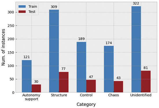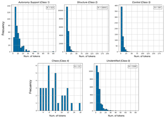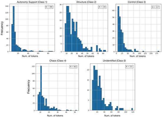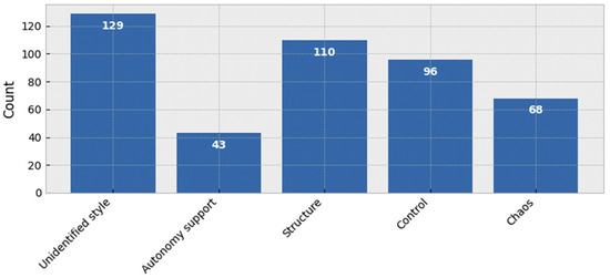 The final dataset comprised 1393 annotated utterances, distributed across five motivational categories. As shown in Table 3, the class Chaos (Label 4) was the most frequent, representing 28.93% of the data, while Unidentified Style (Label 0) was the least common, with 10.84%. The rest of the utterances were distributed across Autonomy Support (386 samples), Structure (236 samples), and Control (217 samples). This design reflects both the original classroom frequency and the intentional balancing measures applied during preprocessing. In addition to class distribution, we analyzed key linguistic features, including average length in characters and word count per utterance. Results revealed that utterances labeled as Chaos and Autonomy Support were significantly shorter on average, while those assigned to Structure and Unidentified Style tended to be longer and more syntactically complex. These differences may influence classification performance due to varying levels of contextual information available in each class. Visual analysis of class distribution is provided in Figure 3, which shows a histogram of utterance frequency per category.