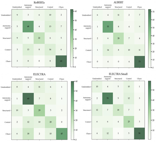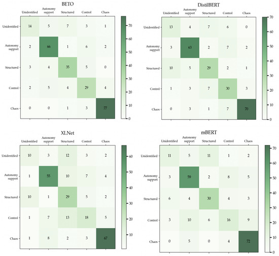In conclusion, performance varied significantly across models, with BETO clearly outperforming the rest due to its language-specific pretraining. DistilBERT and XLNet also deliver competitive results, while RoBERTa and ALBERT fall short in more ambiguous categories. mBERT shows solid cross-lingual generalization, and ELECTRA-Small stands out as a lightweight but robust alternative. Across all models, “Chaos” and “Autonomy Support” consistently achieved the highest F1 scores, indicating well-defined linguistic patterns. In contrast, “Control” and “Unclassified” remain the most challenging, underscoring the complexity of modeling motivational discourse categories when theoretical overlap exists.
