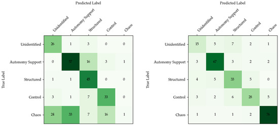 In order to complement the comparative evaluation across models, an extended statistical analysis was conducted to quantify the robustness of BETO’s performance and to assess the contribution of the data augmentation strategy. Following standard practice in multi-class classification, stratified bootstrap confidence intervals, approximate randomization tests, and one-vs-rest McNemar tests were applied to the results. The ablation between BETO with and without data augmentation was first examined. Both variants were evaluated on the same held-out test set, which included expert-validated synthetic utterances to minimize evaluation bias. As presented in Table 8, accuracy was found to increase from 0.58 (95% CI: 0.54–0.62) to 0.78 (95% CI: 0.74–0.83) when augmentation was applied. Similarly, Macro-F1 rose from 0.54 (95% CI: 0.51–0.58) to 0.73 (95% CI: 0.68–0.79). Approximate randomization tests with 10,000 permutations confirmed that these improvements were statistically significant (p < 0.001 for both metrics). The most substantial gains were observed in minority classes. In Chaos (class 4), performance improved from an F1 of 0.02 without augmentation to 0.92 with augmentation, while in Autonomy Support (class 1) the F1 increased from 0.67 to 0.85. A confusion matrix comparing BETO with and without augmentation is displayed in Figure 9, illustrating the reduction in systematic misclassifications when synthetic data were incorporated.